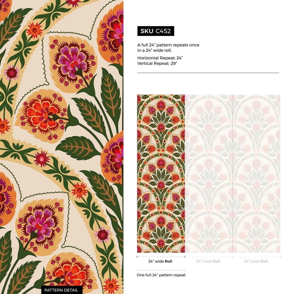 Introduce a touch of timeless elegance with this Art Nouveau wallpaper, featuring stylized florals in rich green, orange, and pink. This wallcovering showcases an intricate, arched pattern with a folk-art-inspired motif, creating a captivating visual for any interior. The vibrant colors and flowing lines are perfect for anyone looking to incorporate sophisticated wall art into their home decor.