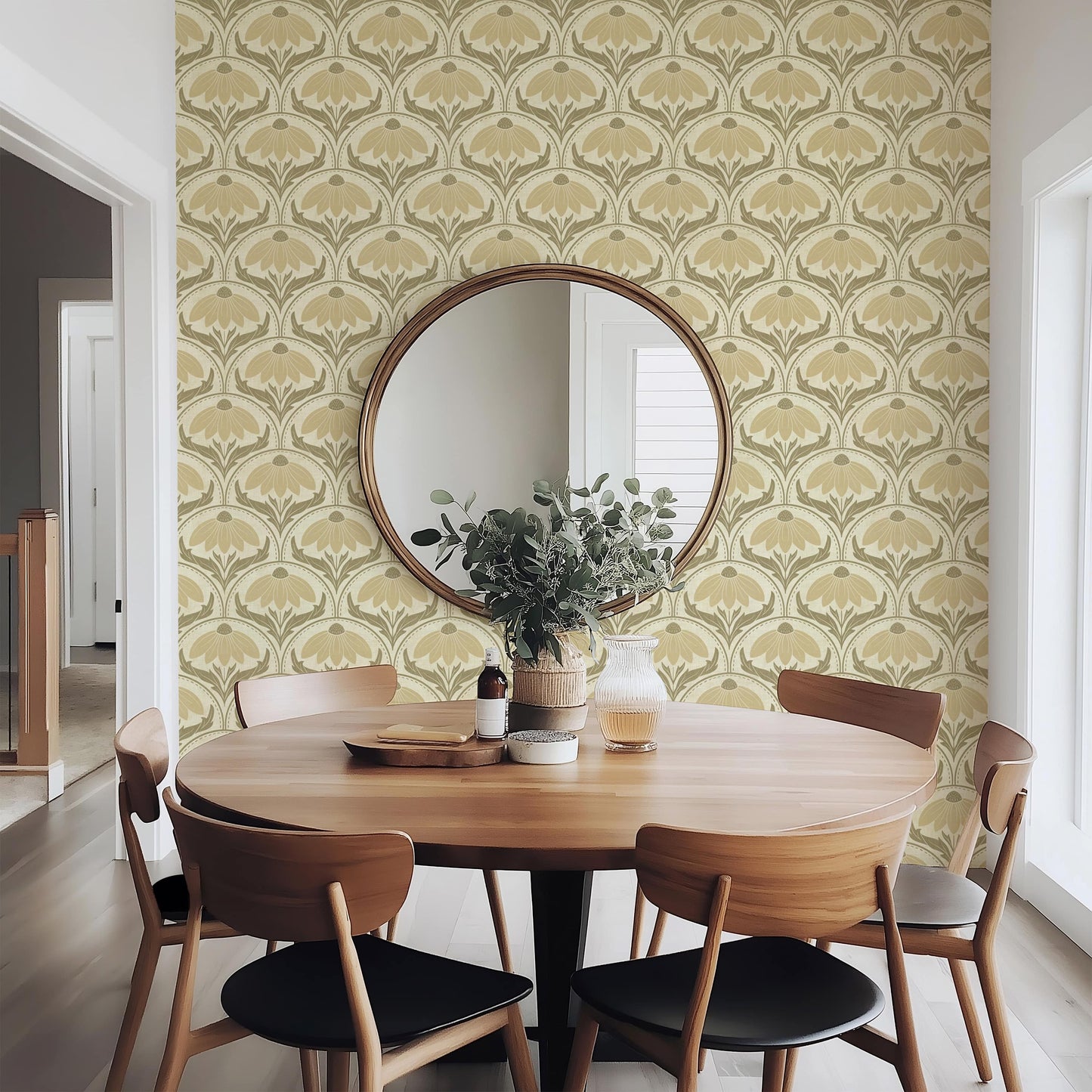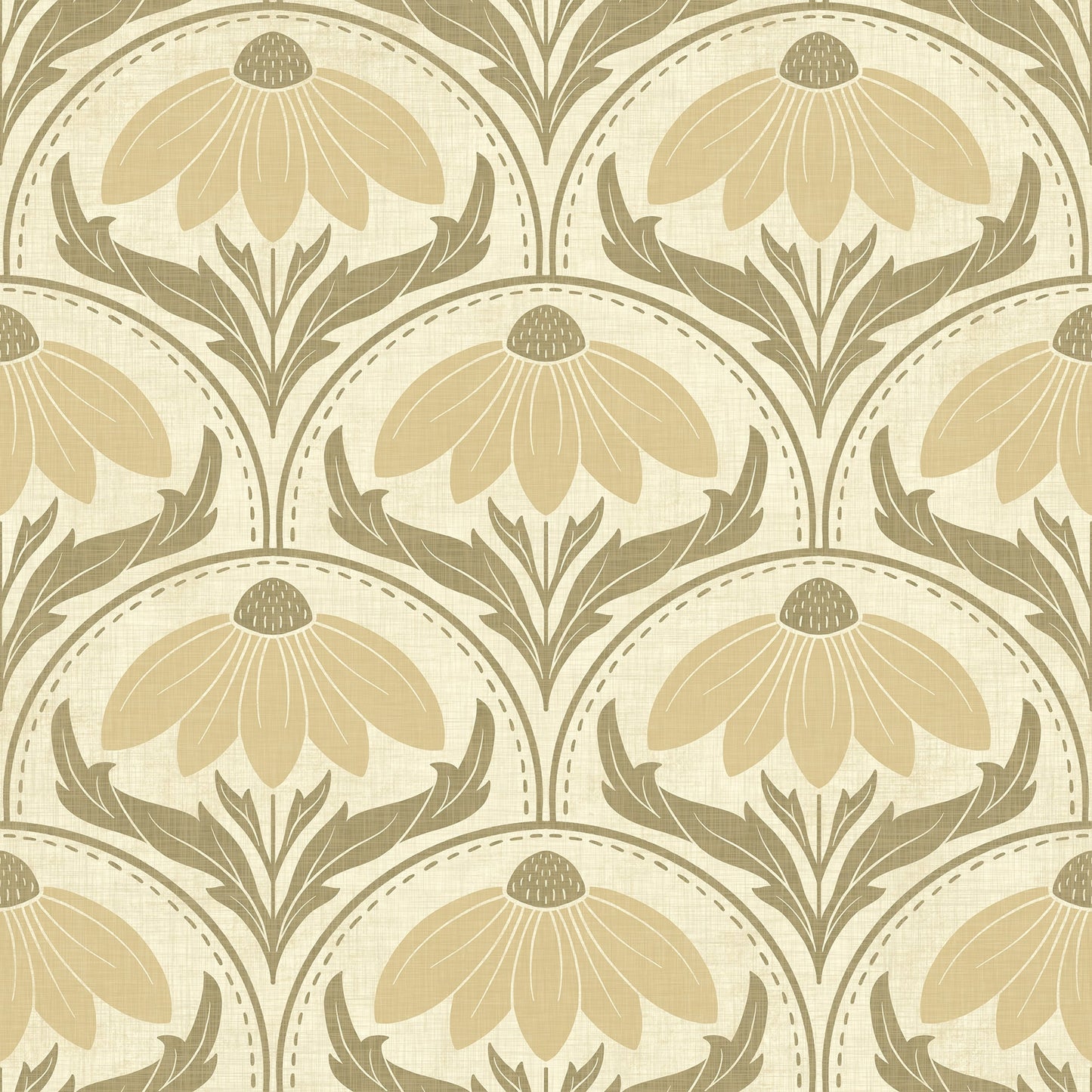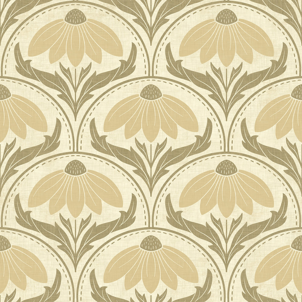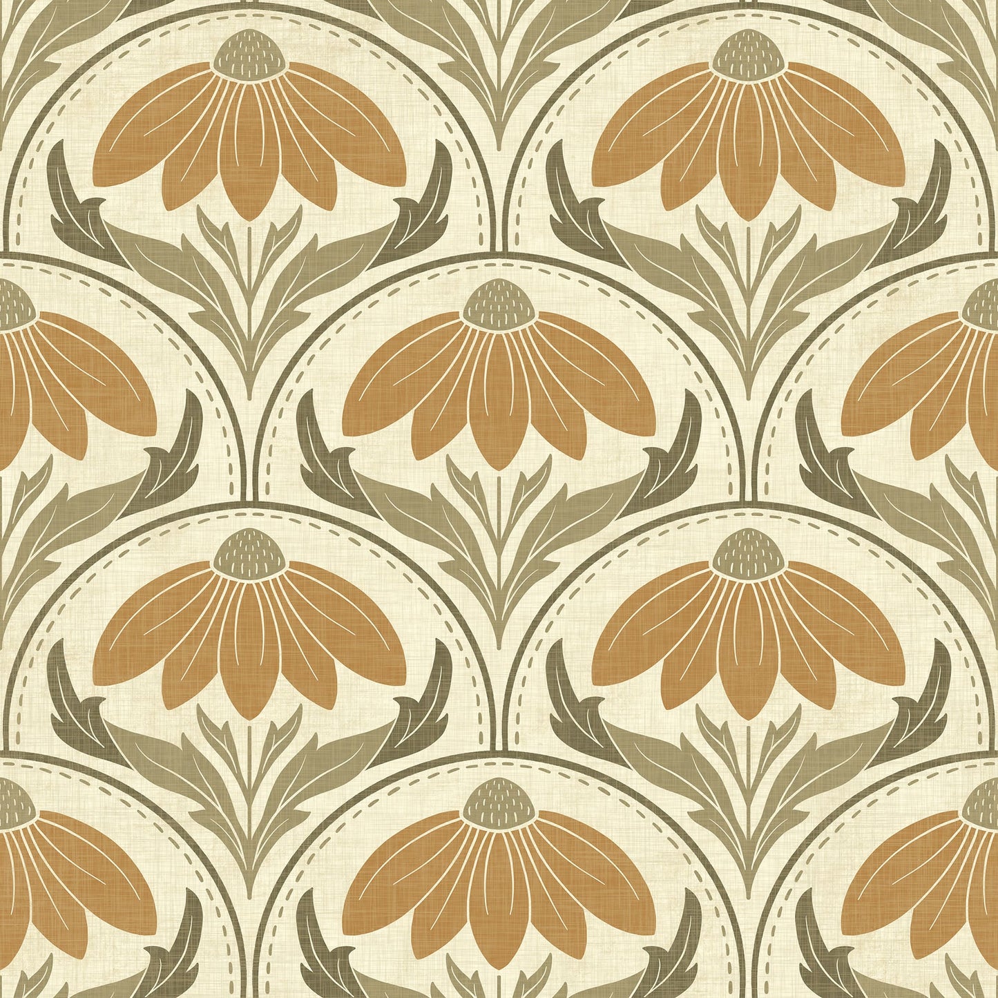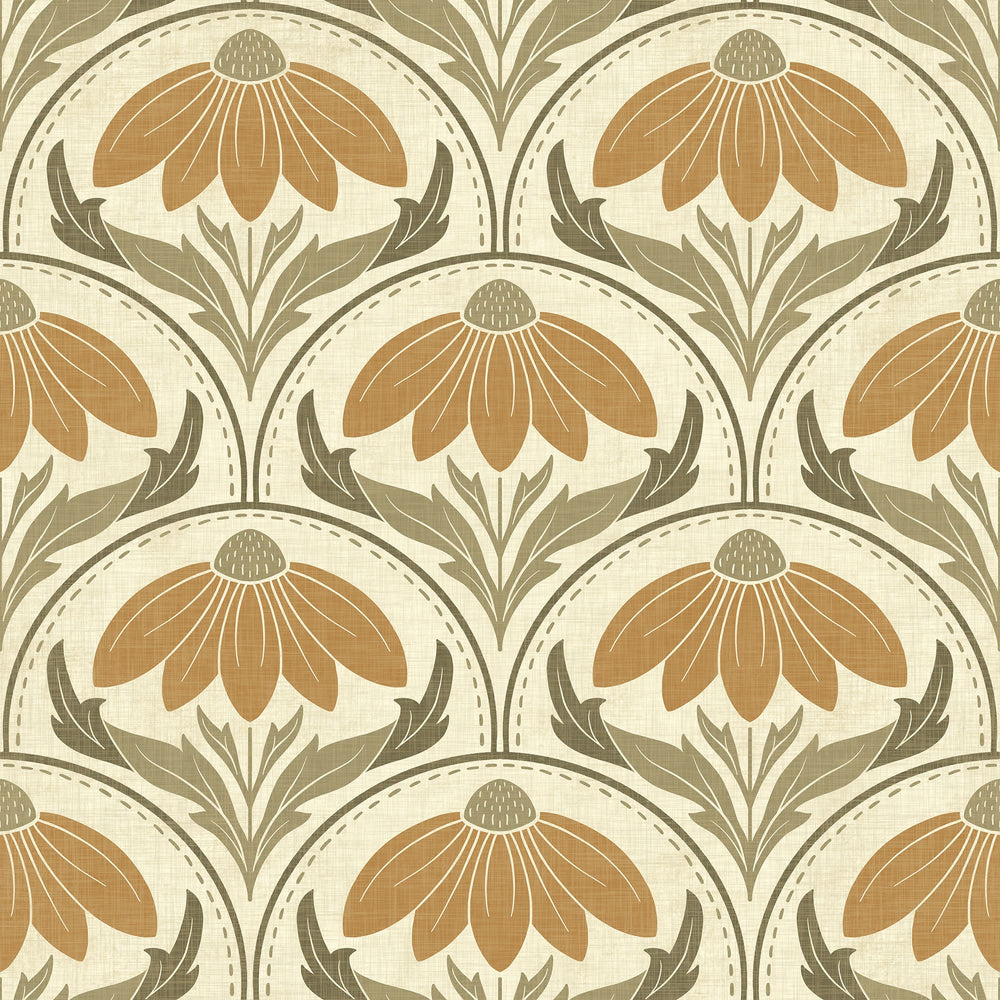Inspired by the quiet rhythm of English gardens, this Scalloped Coneflower Wallpaper brings a sense of harmony and grounded beauty into any space. Hand drawn by designer Jasmine Hnatkova, the design features soft coneflowers framed in elegant scalloped arches, creating a repeat that feels both timeless and uniquely modern.