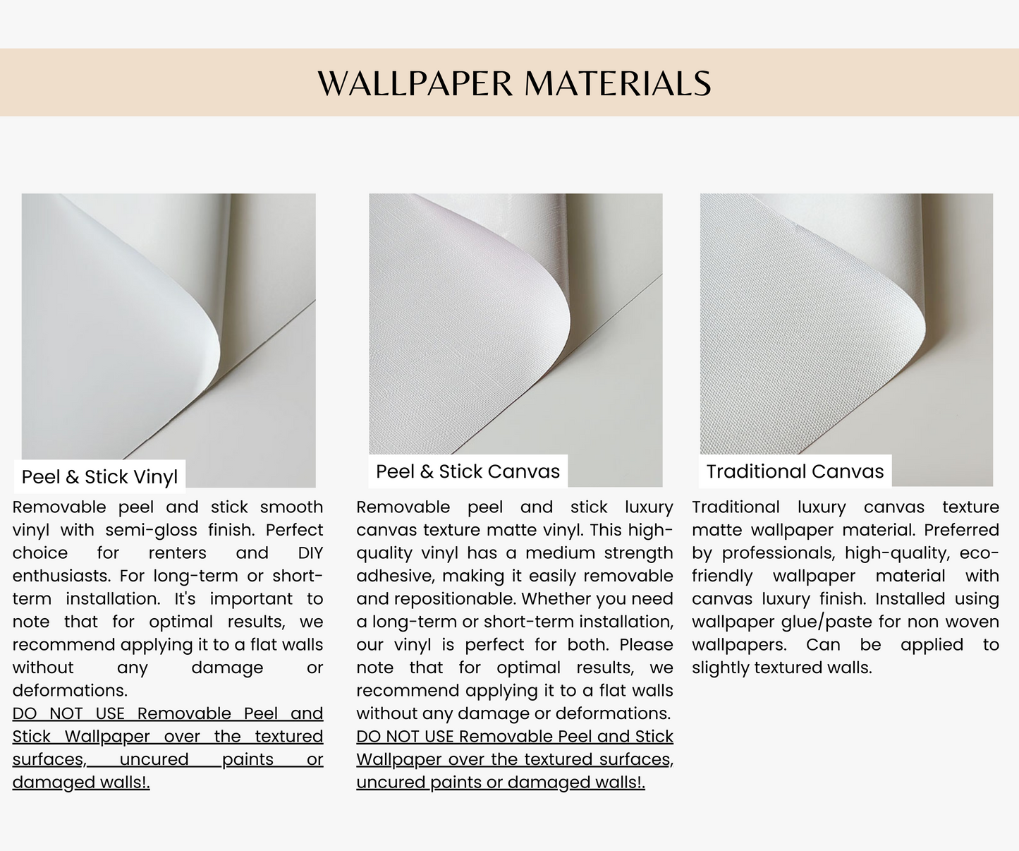 Available in removable peel and stick or traditional wallpaper. Printed on eco friendly materials with a soft matte finish.