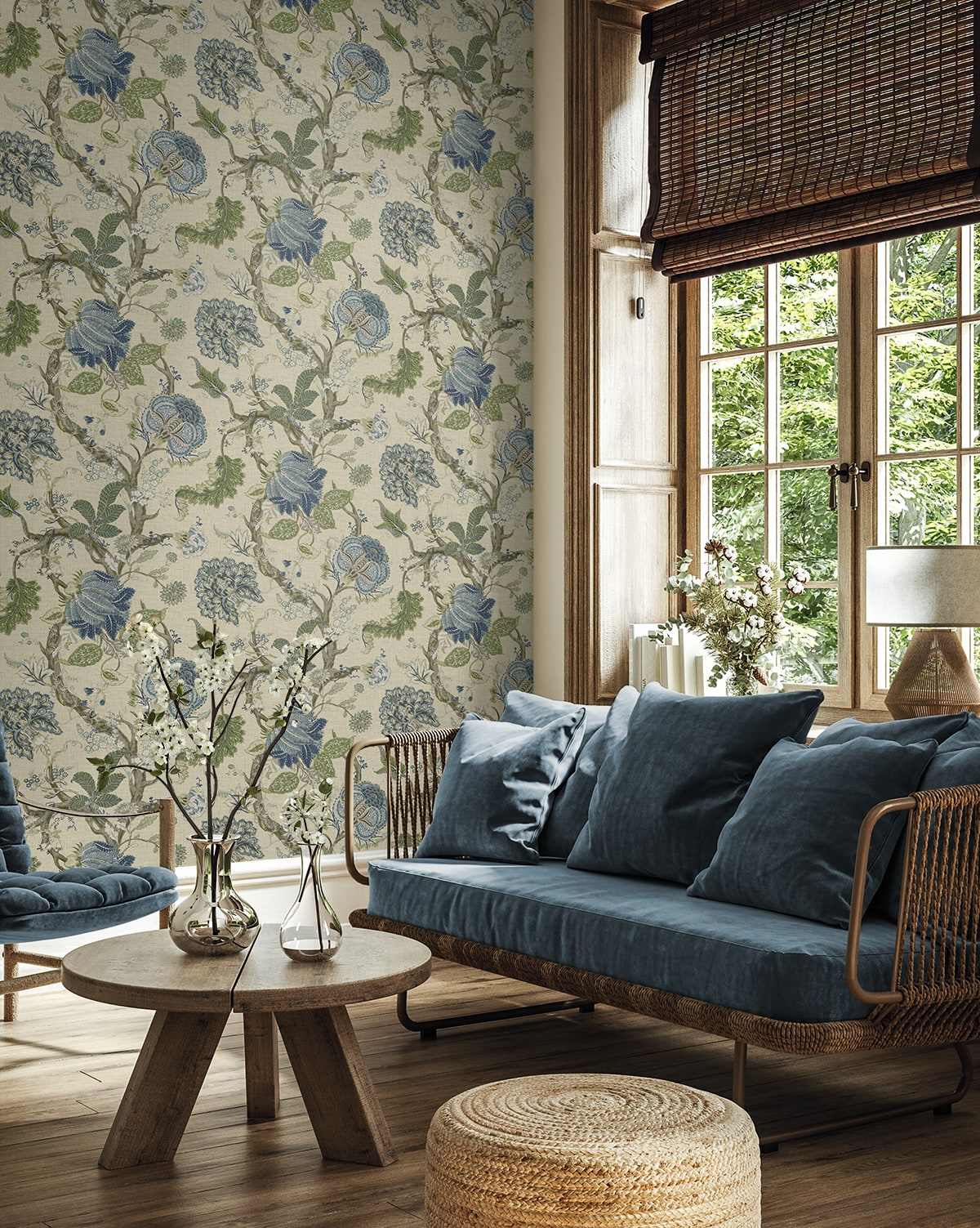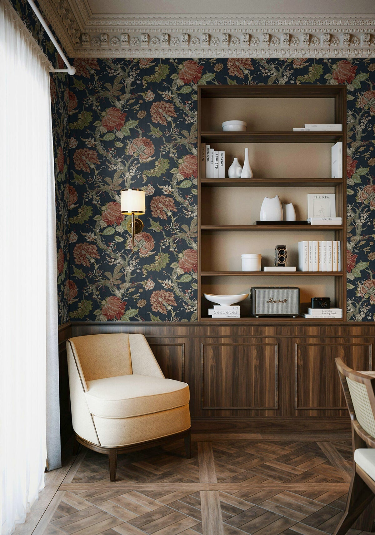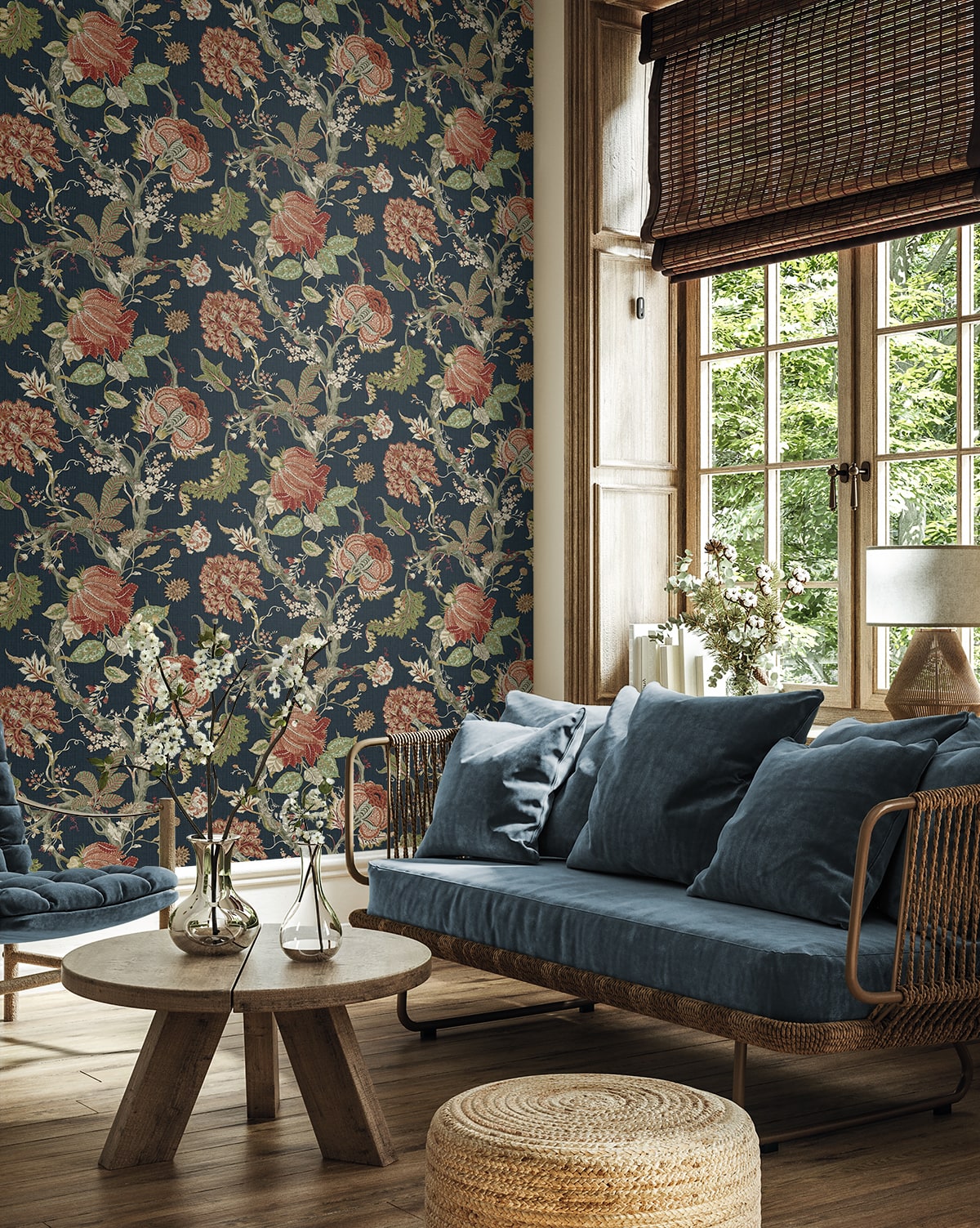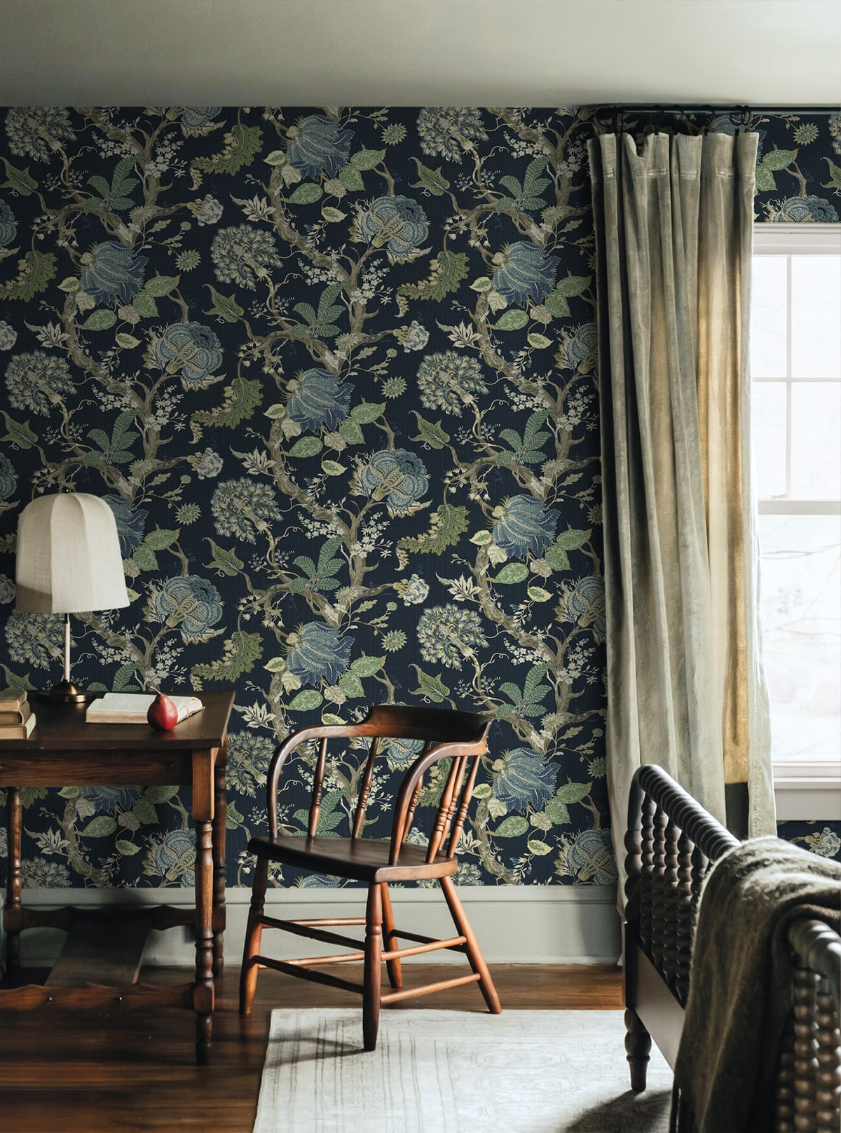 Equally at home in formal dining rooms and cozy sitting areas, this Jacobean Trail Premium Matte Non-Woven peel and stick wallpaper pattern will flourish when paired with rich, earthy tones, natural woods, and antique furnishings. Featuring an engineered non-woven surface, this product delivers rich colors with a fabric-like, PVC-free eco finish.